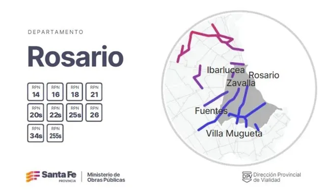 * Departamento Rosario: RPN° 14, 16, 18, 21, 20-S, 22-S, 25-S, 26, 34-S y 255-S.