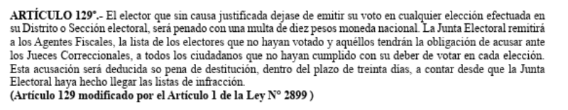 “El elector que sin causa justificada dejase de emitir su voto en cualquier elección efectuada en su Distrito o Sección electoral, será penado con una multa de diez pesos moneda nacional”, sostiene el artículo 129 de la ley 2.600 sancionada en 1940.