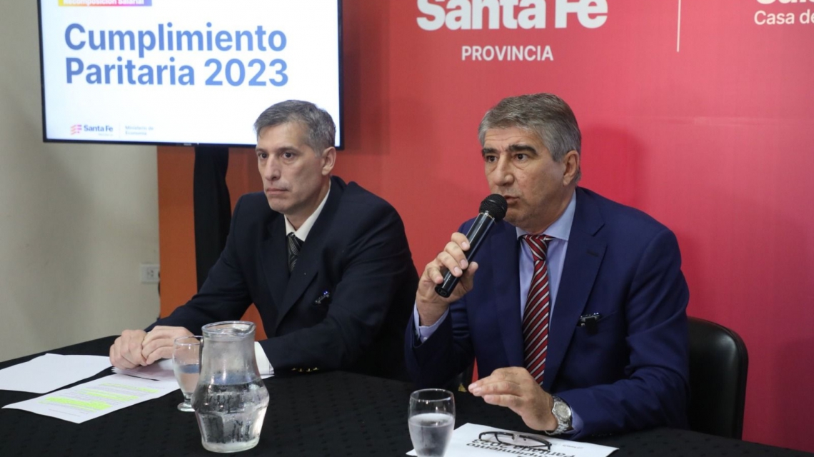 Los ministros de Gobierno e Innovación Pública, Fabián Bastia, y de Economía, Pablo Olivares, anunciaron este lunes que el gobierno provincial cumplirá con la totalidad de la Paritaria 2023, cuyo aumento salarial alcanza el 36,4% respecto de los sueldos de diciembre pasado y permitirá alcanzar un crecimiento anual del 215 % en los salarios estatales, aunque los ingresos en Provincia fueron muy por debajo de ese índice.