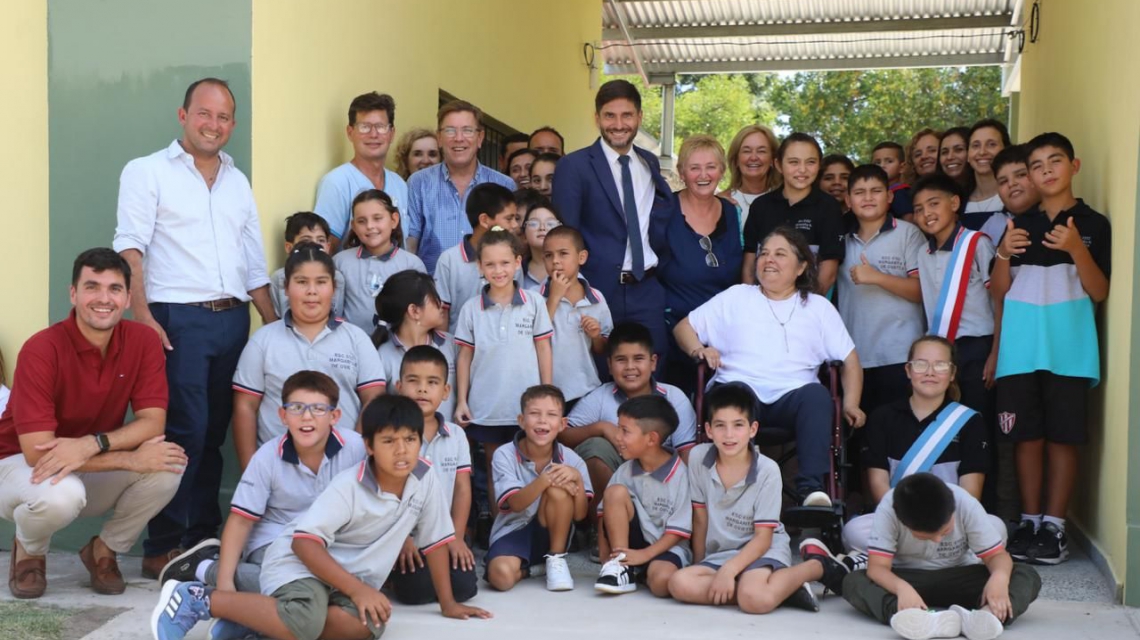 El gobernador Maximiliano Pullaro participó este lunes del inicio del ciclo lectivo en la Escuela N.º 6132 “Margarita Bustos de Ovietta” de Colonia Angeloni, departamento San Justo. Durante el acto, además, se inauguró un aula construida en el marco del programa provincial 1.000 Aulas.