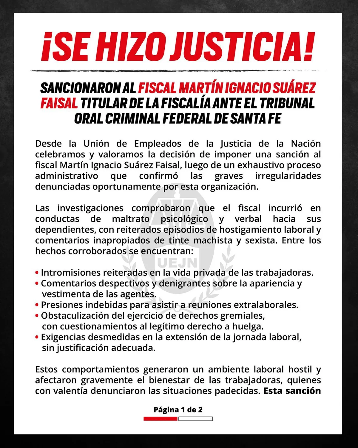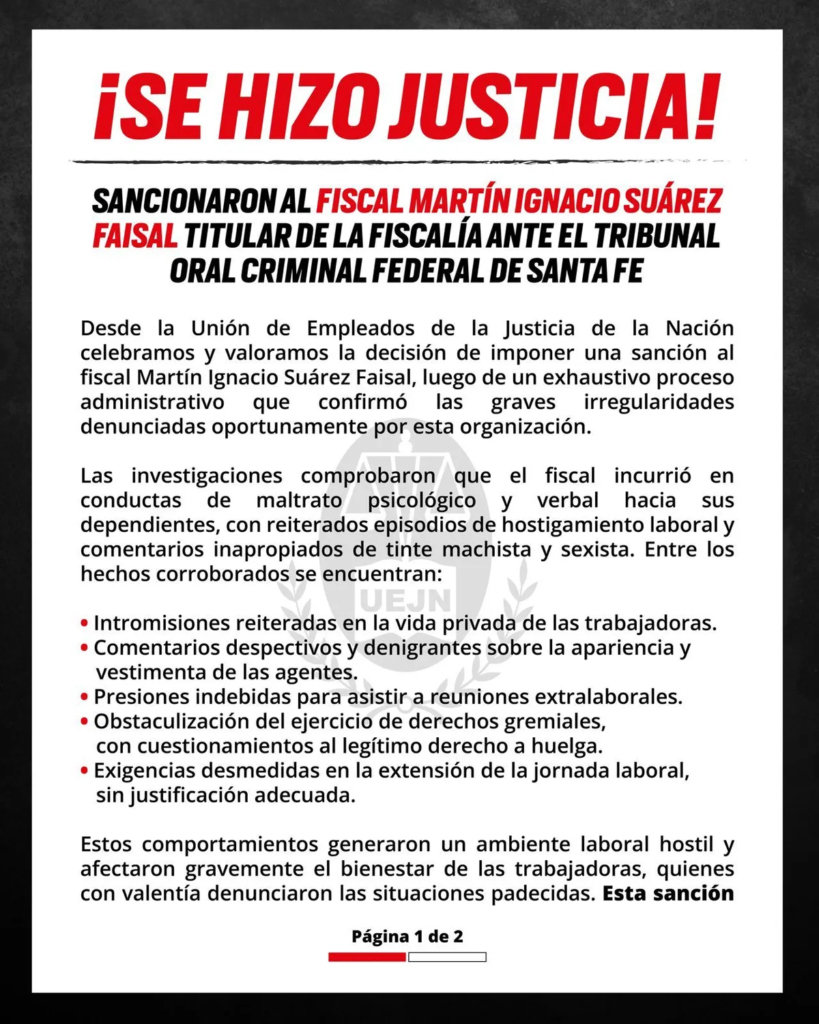 La Unión de Empleados de la Justicia de la Nación celebró la sanción dispuesta contra el fiscal federal de Santa Fe. «Las investigaciones comprobaron que el fiscal incurrió en conductas de maltrato psicológico y verbal hacia sus dependientes, con reiterados episodios de hostigamiento laboral y comentarios inapropiados de tinte machista y sexistas», escribieron en un comunicado.