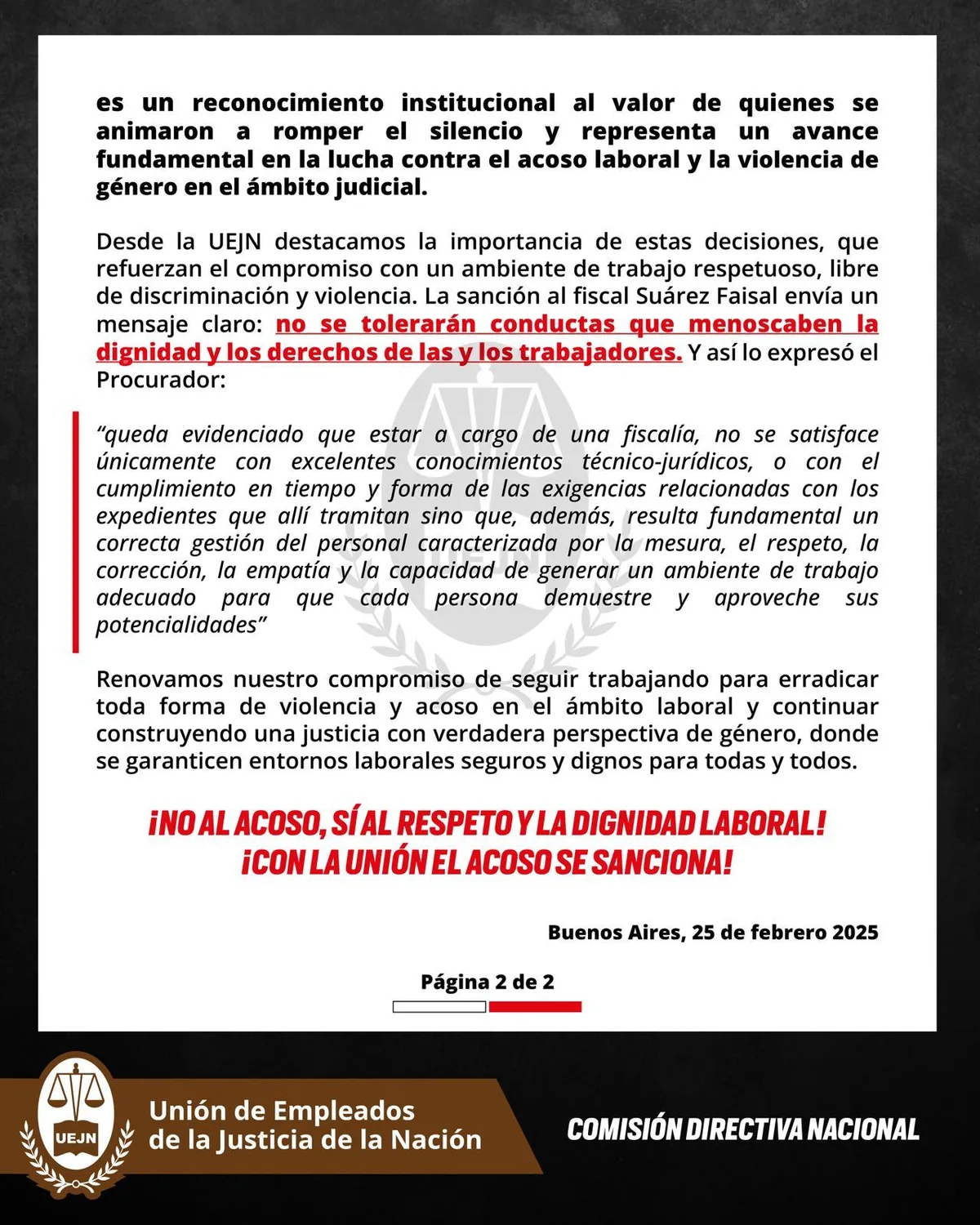 «Esta sanción es un reconocimiento institucional al valor de quienes se animaron a romper el silencio y representa un avance fundamental en la lucha contra el acoso laboral y la violencia de género en el ámbito judicial», sumaron.