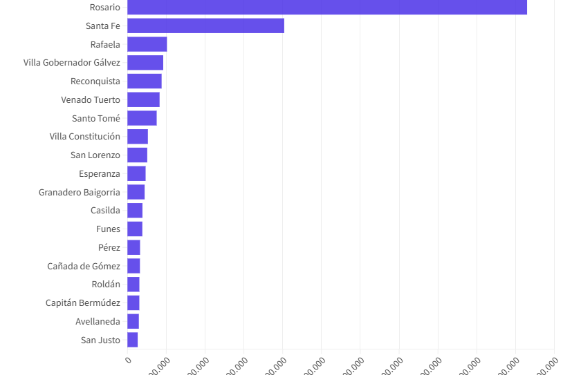 Cerca de ese número está Villa Gobernador Gálvez con 92.137 y ya un poco más atrás Reconquista (87.965) y Venado Tuerto (82.757).