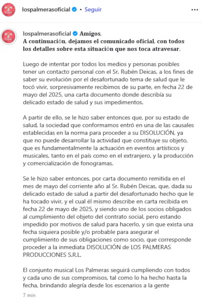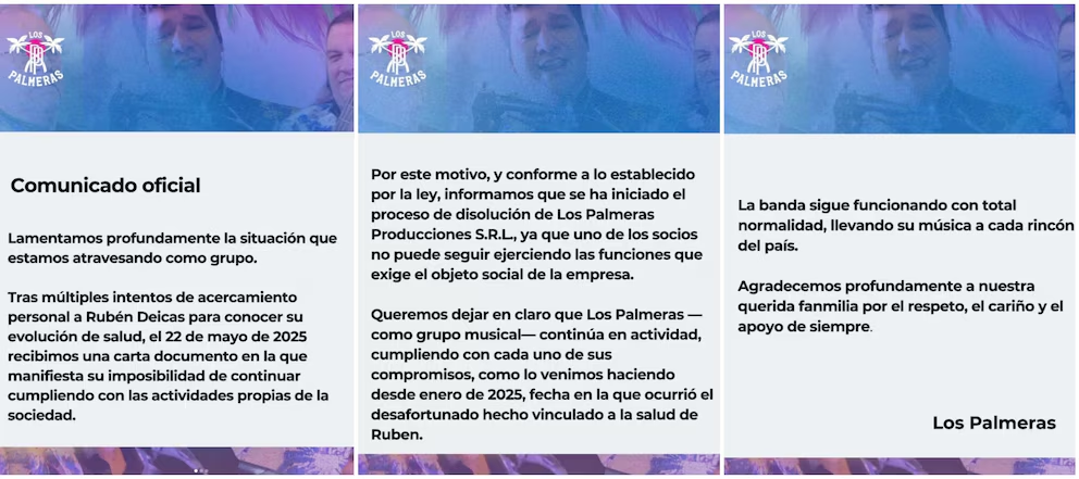 Además, la banda explicó que «se le hizo saber entonces, por carta documento remitida en el mes de mayo del corriente año al Sr. Rubén Deicas que, dada su delicado estado de salud a partir del desafortunado hecho que le ha tocado vivir, y el cual él mismo describe en carta recibida en fecha 22 de mayo de 2025, y siendo uno de los socios obligados al cumplimiento del objeto del contrato social, pero estando impedido por motivos de salud para hacerlo, y sin que exista una fecha siquiera posible y/o probable para asegurar el cumplimiento de sus obligaciones como socio, que corresponde proceder a la inmediata DISOLUCIÓN de LOS PALMERAS PRODUCCIONES S.R.L.”.